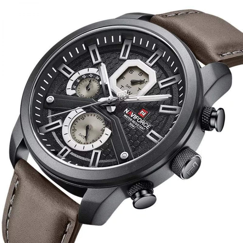 ساعة NAVIFORCE NF9211L-B-B-GY للرجال - ساعة أنالوج جلدية بمينا أسود