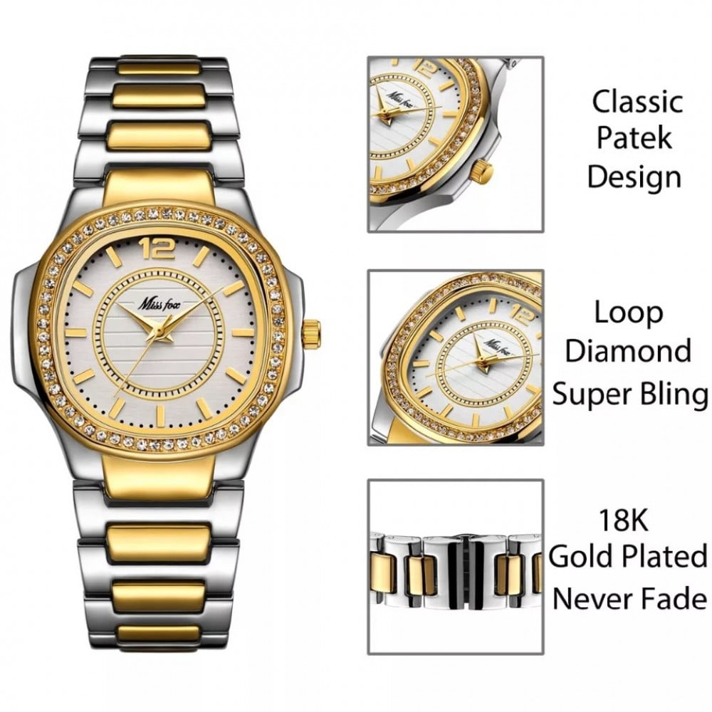 تتميز الساعة بإطار معدني أنيق مطلي بالذهب، مع قرص مزين بأحجار الألماس البراقة التي تعكس الضوء بطريقة مبهرة. علامات الوقت على القرص مصممة بشكل واضح لتسهيل قراءة الوقت، مع لمسات فنية تجعلها قطعة فريدة من نوعها. تصميم الساعة يعكس الأناقة الخالدة التي تناسب جميع الأذواق.